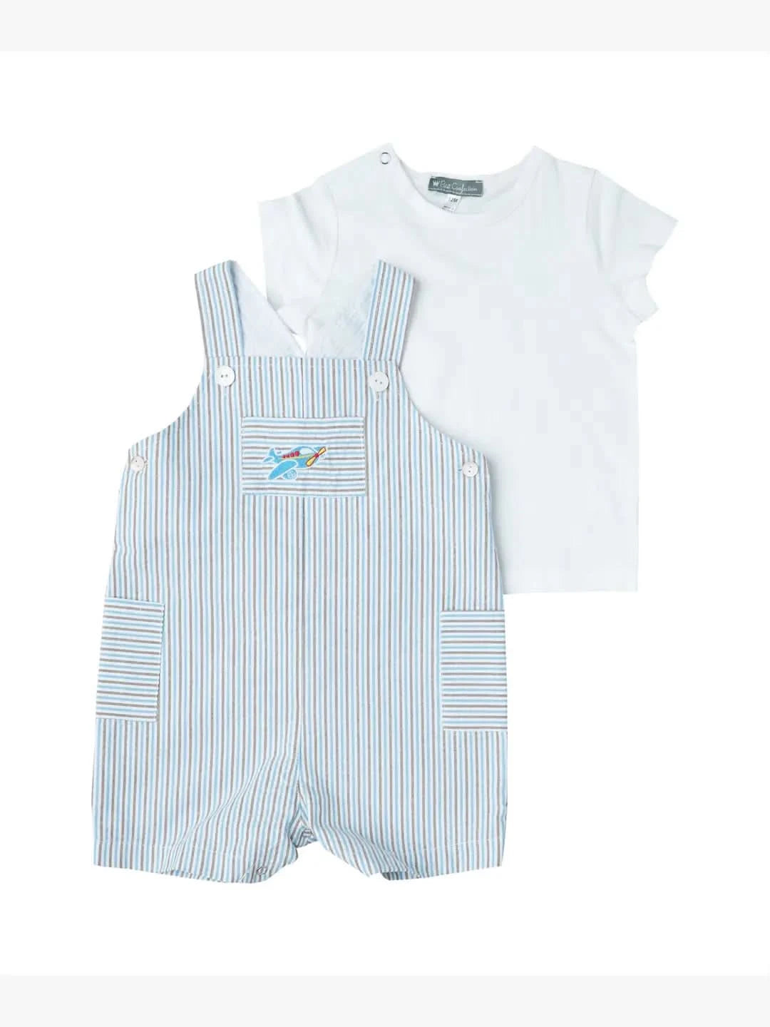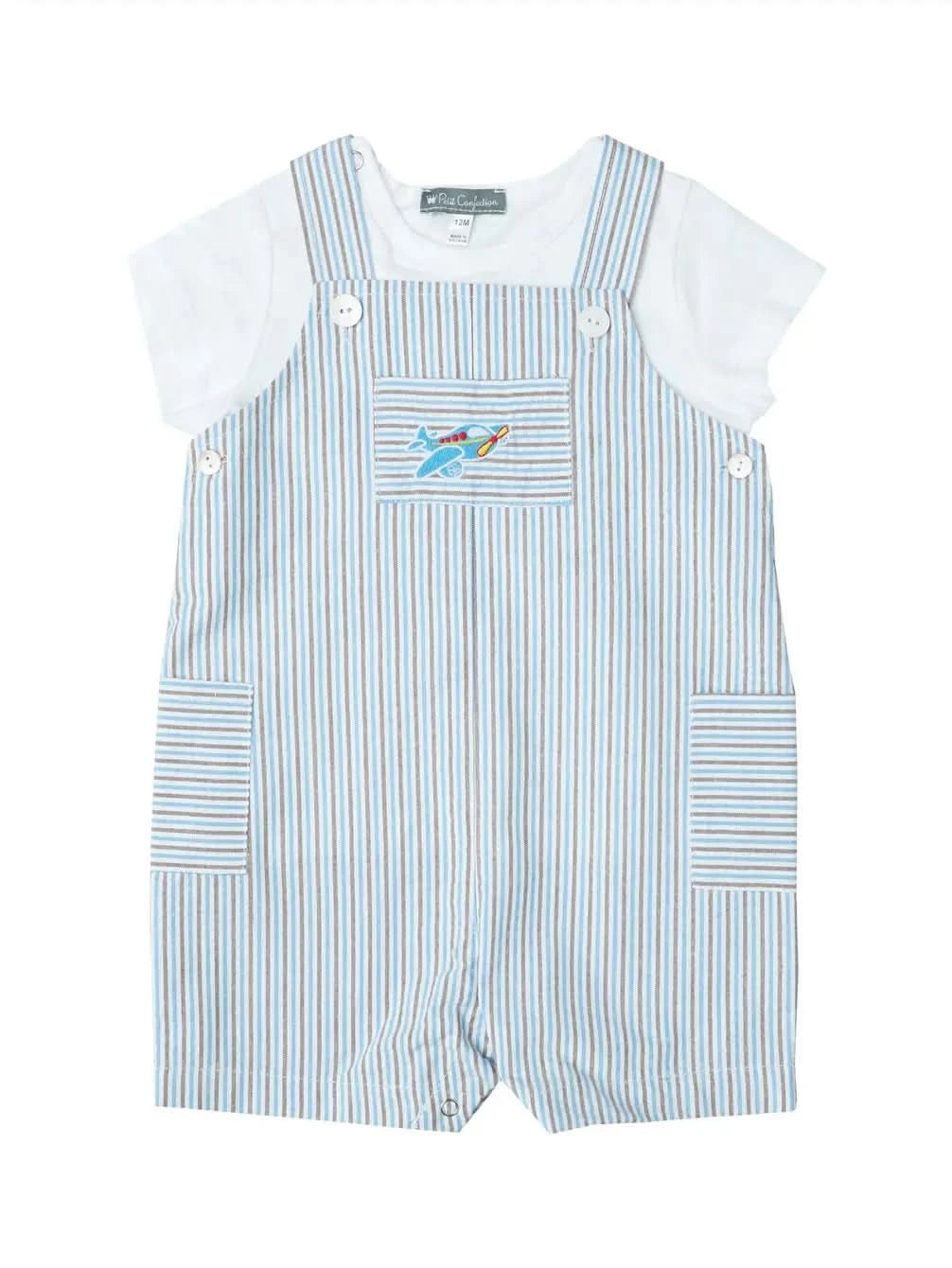 Infant seersucker helicopter overalls with hand embroidered applique and white cotton tee shirt