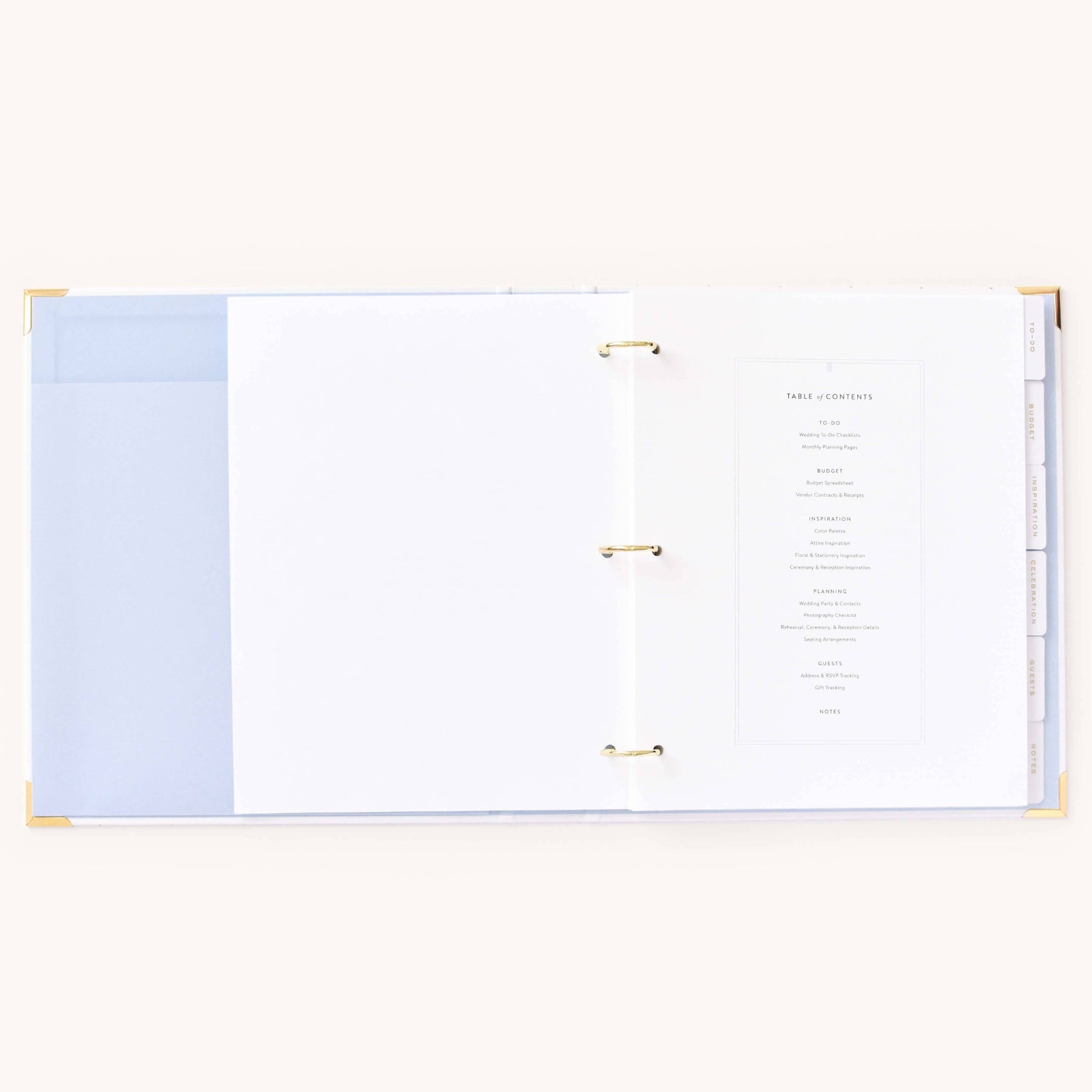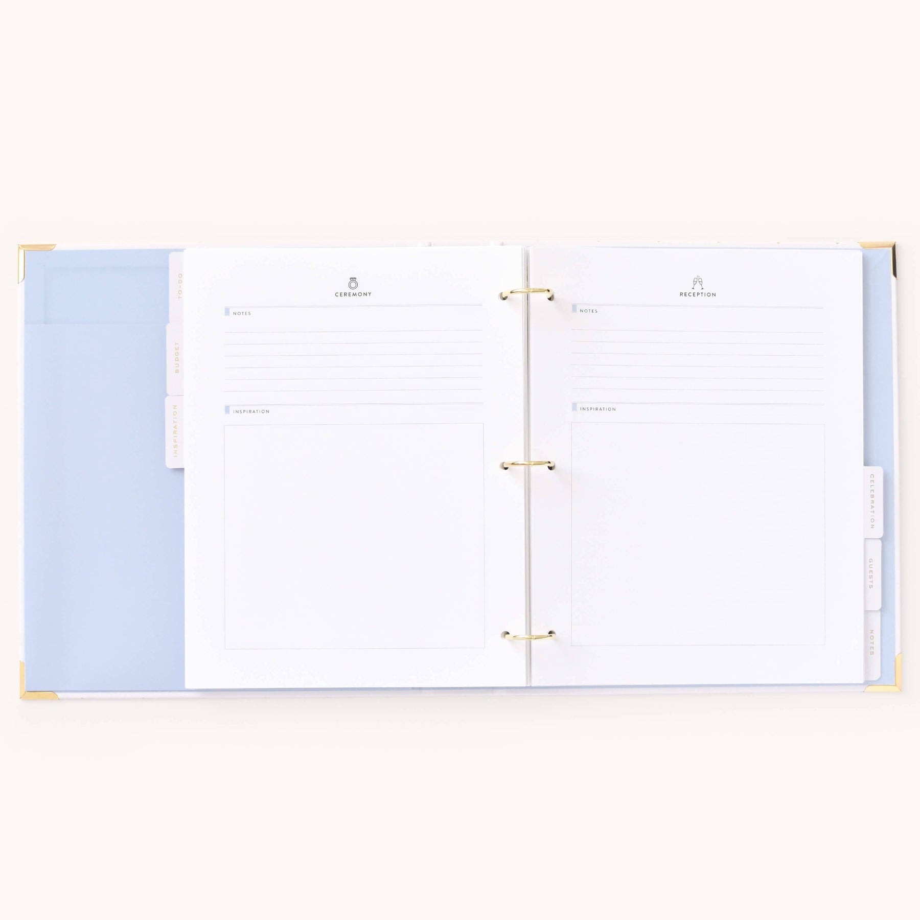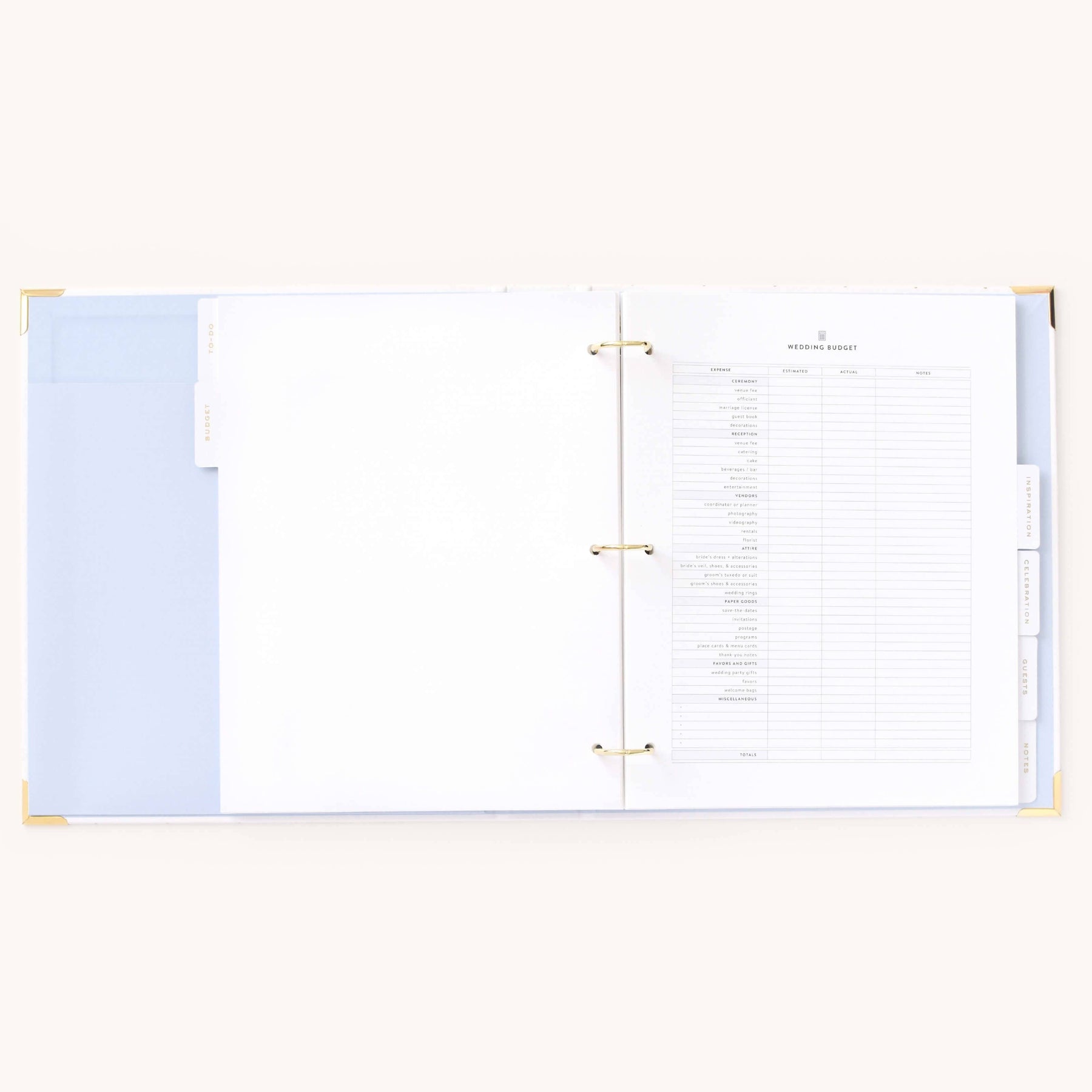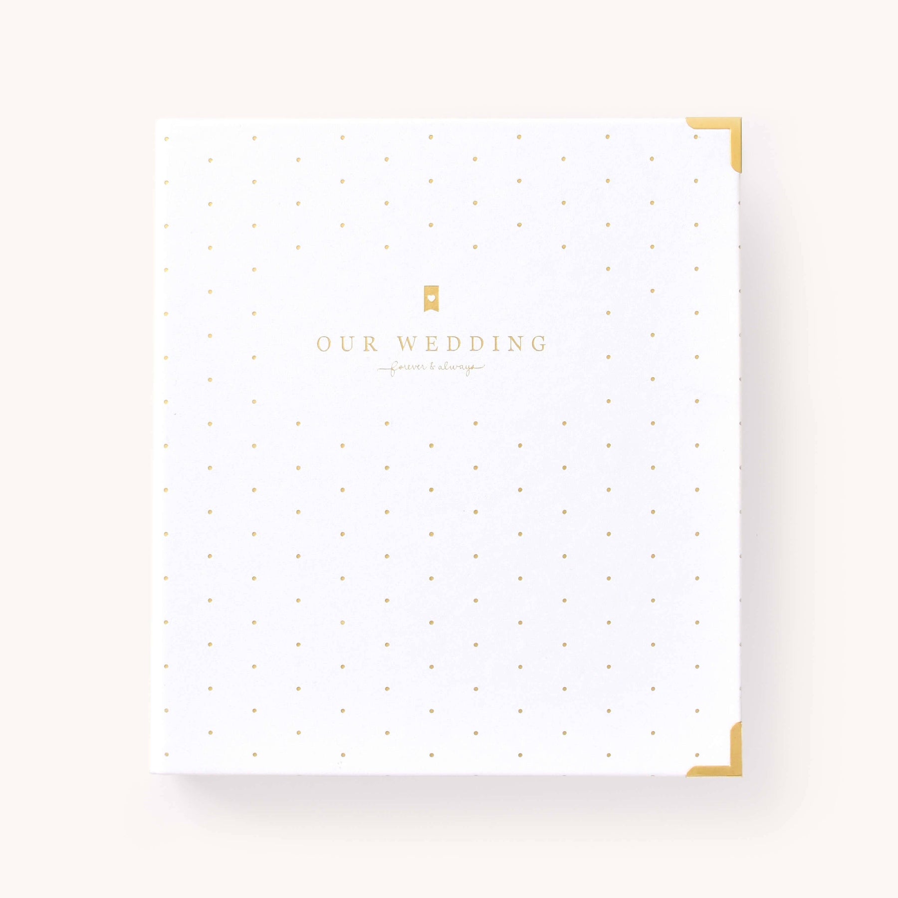This wedding planner is designed to help couples stay organized while planning their big day. Packaged in a beautifully crafted box with elegant gold foil details, this undated binder-style planner features a white leatherette cover with a subtle dot pattern, gold protective corners, and a coordinating inside liner and pocket. It includes a sticker sheet, six sections filled with planning pages and worksheets, and high-quality pure white paper, making it a thoughtful and practical tool for wedding planning.