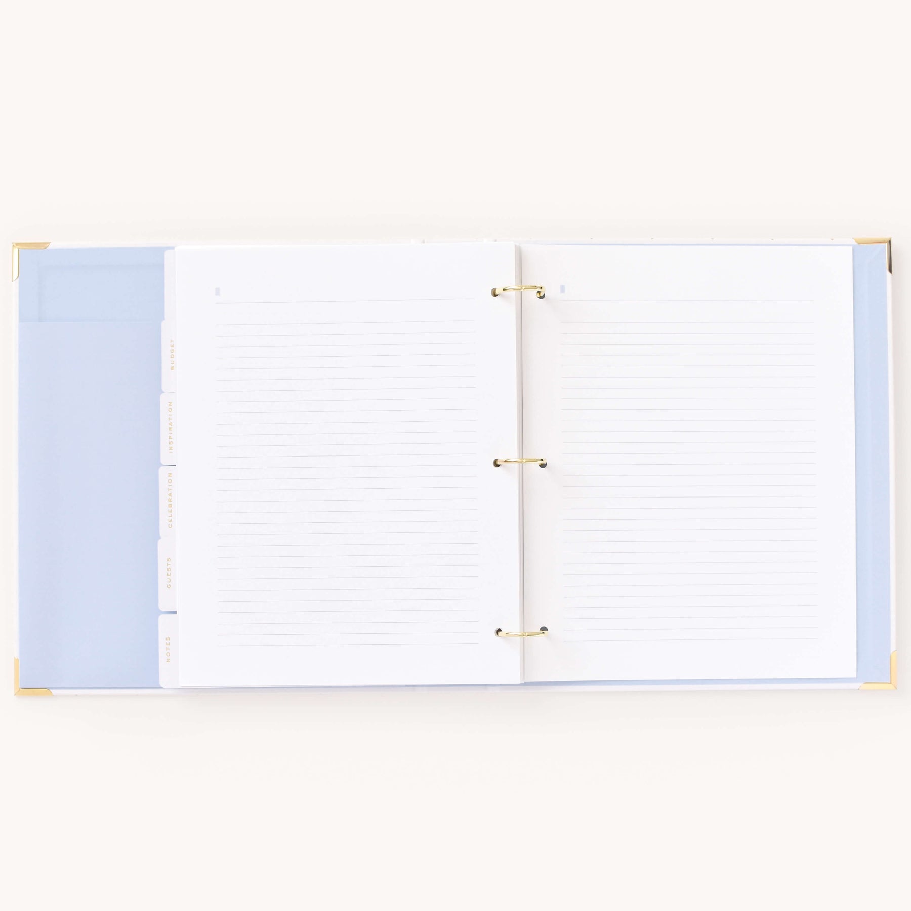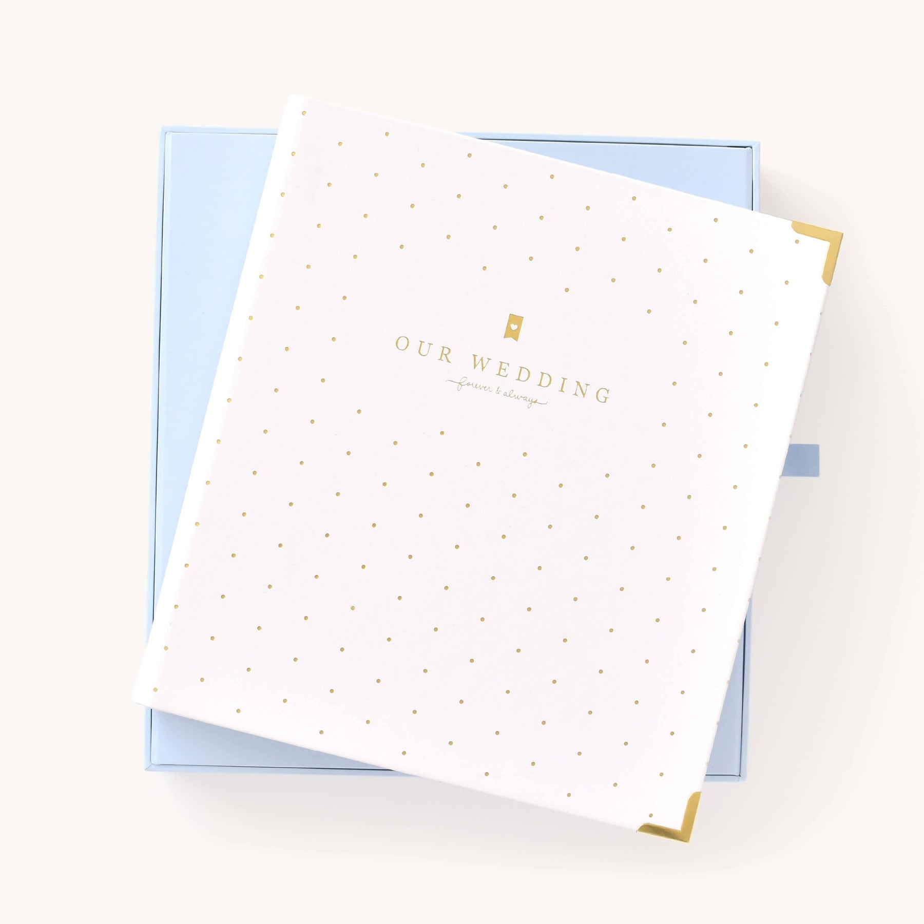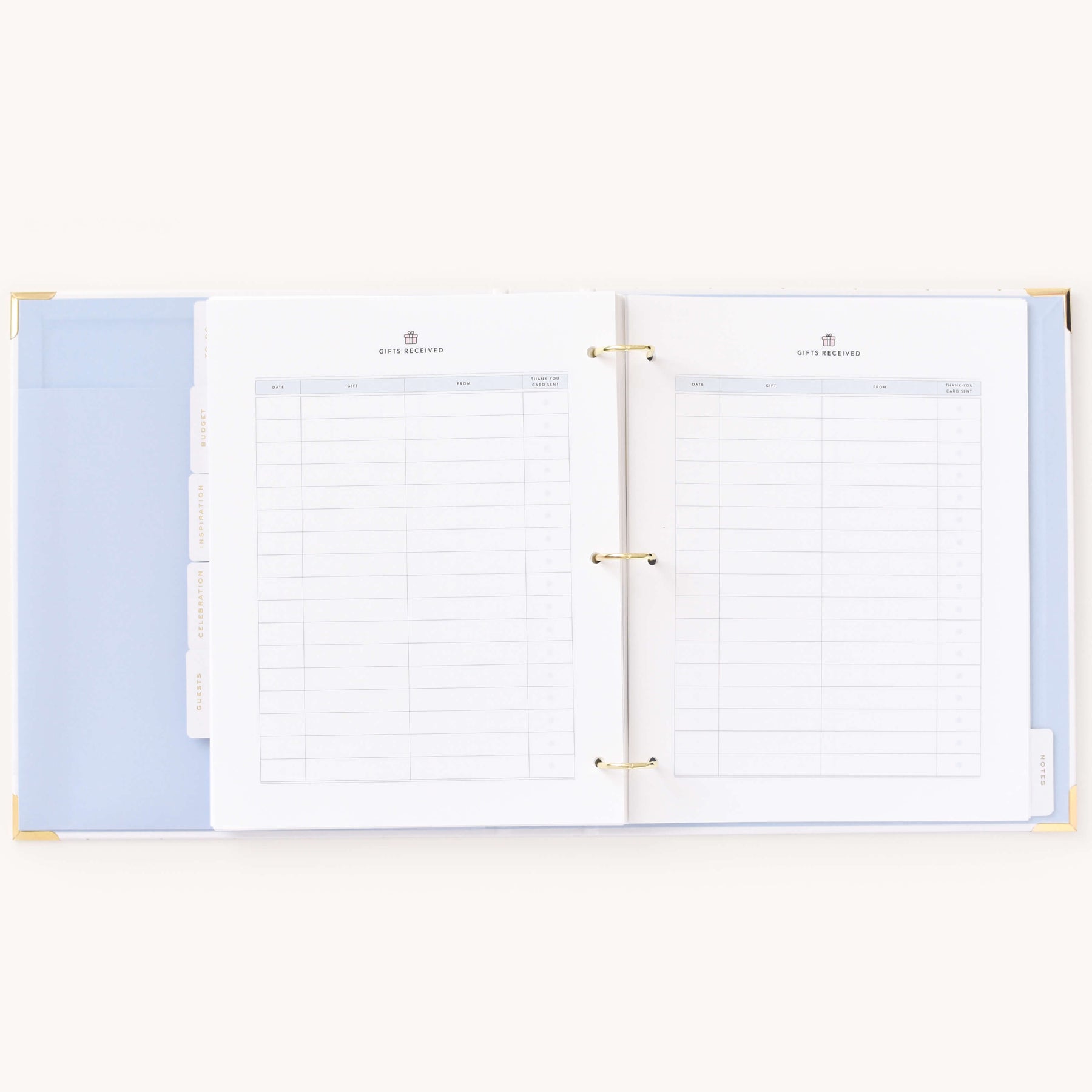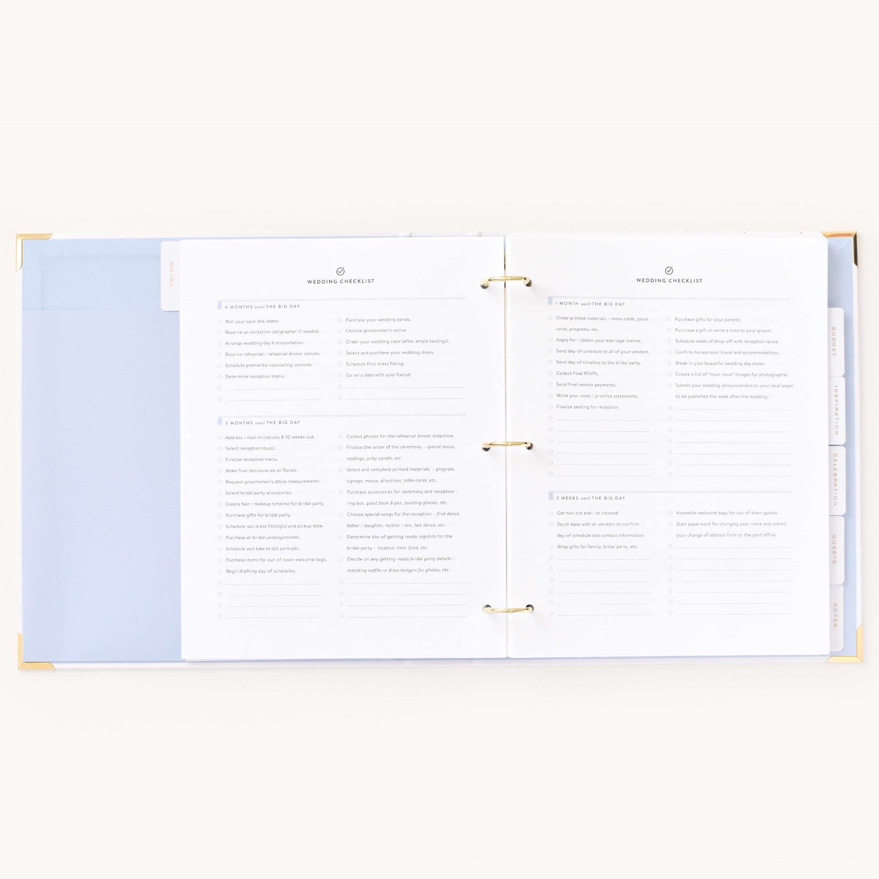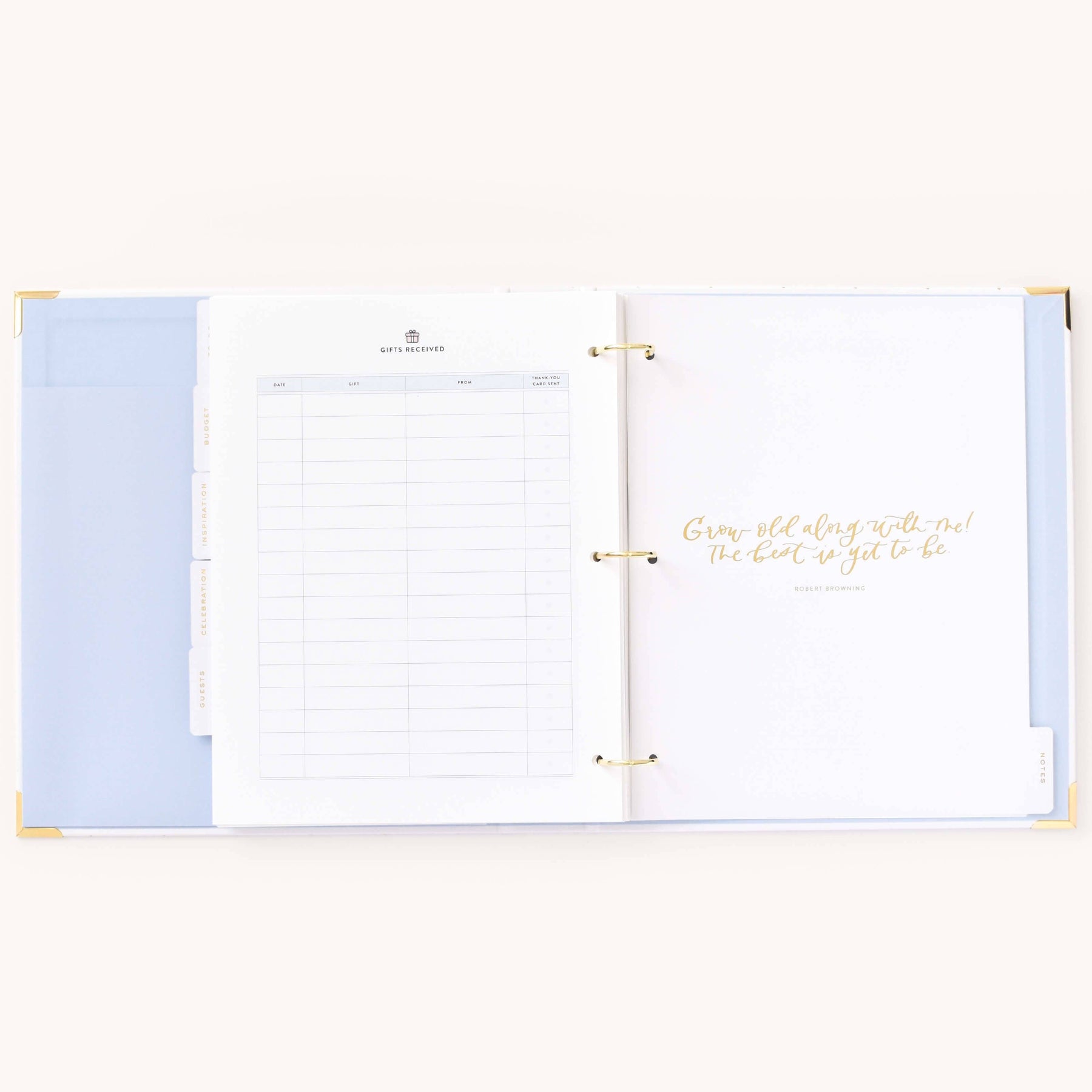 This wedding planner is designed to help couples stay organized while planning their big day. Packaged in a beautifully crafted box with elegant gold foil details, this undated binder-style planner features a white leatherette cover with a subtle dot pattern, gold protective corners, and a coordinating inside liner and pocket. It includes a sticker sheet, six sections filled with planning pages and worksheets, and high-quality pure white paper, making it a thoughtful and practical tool for wedding planning.