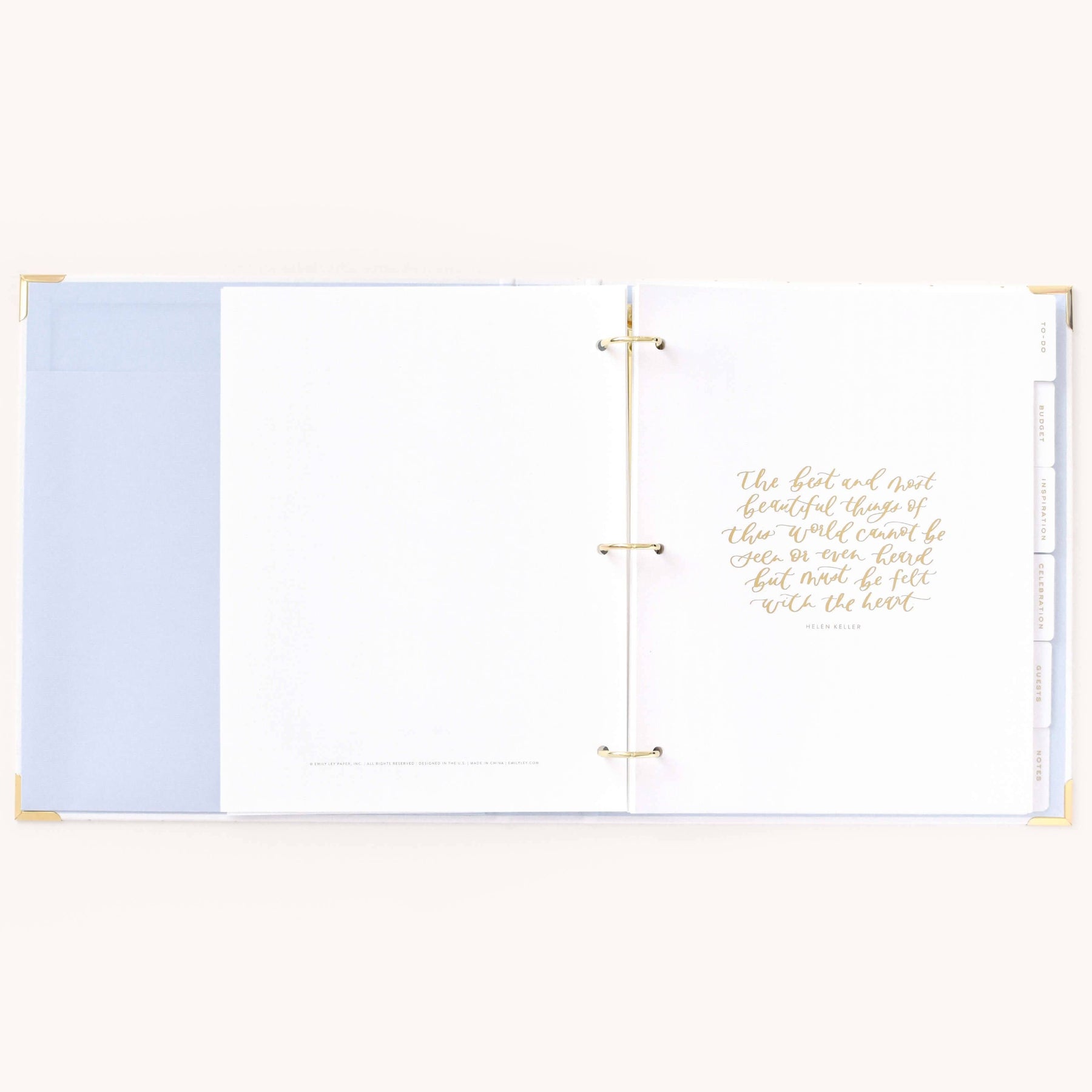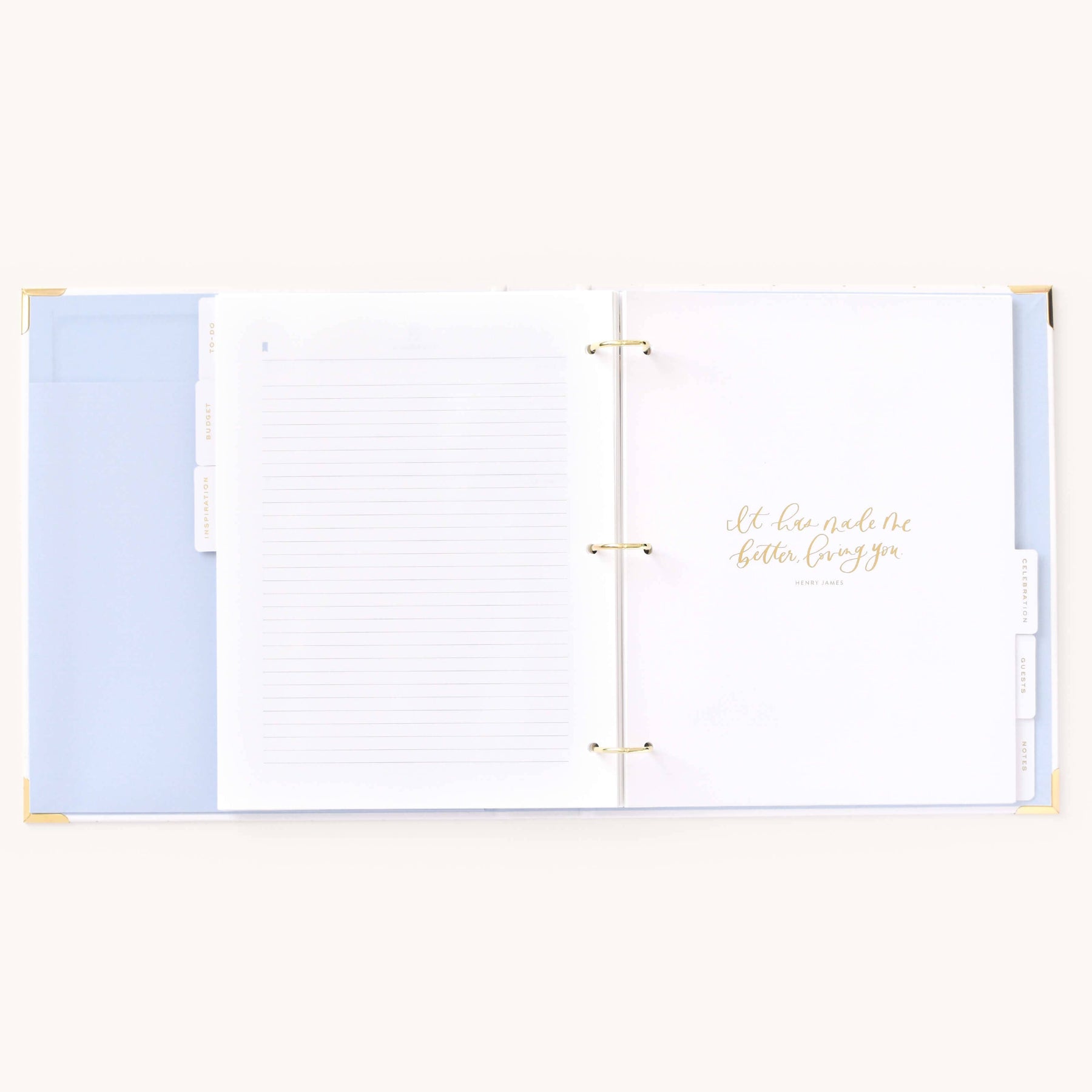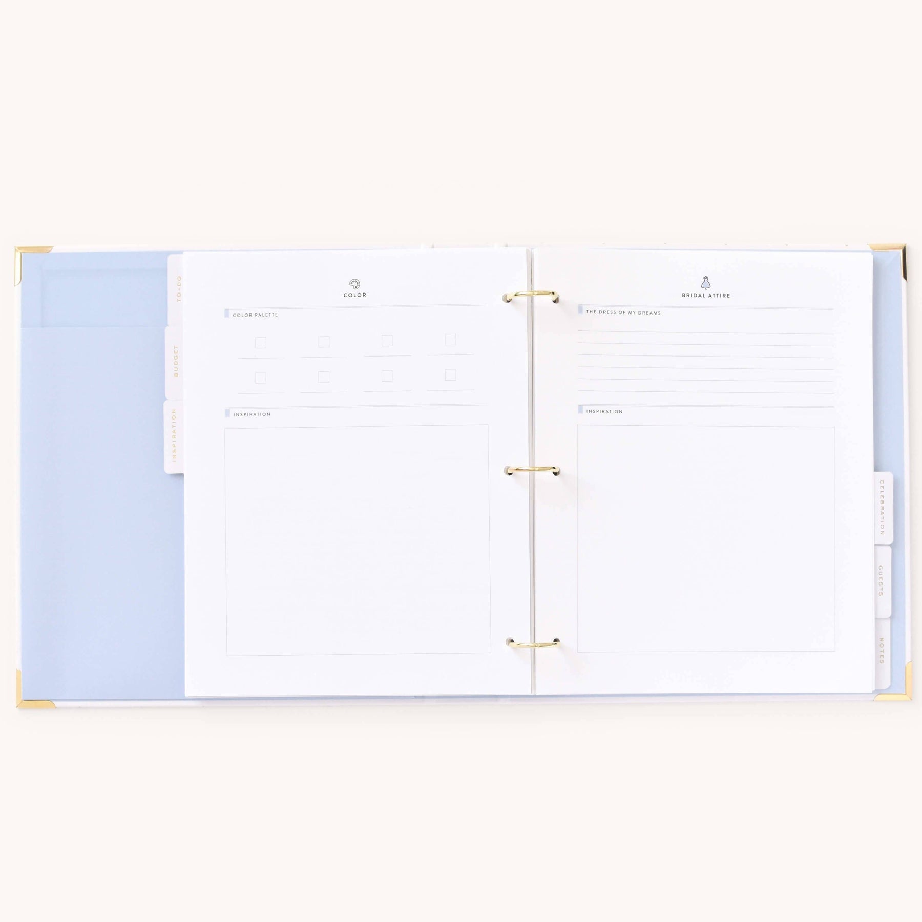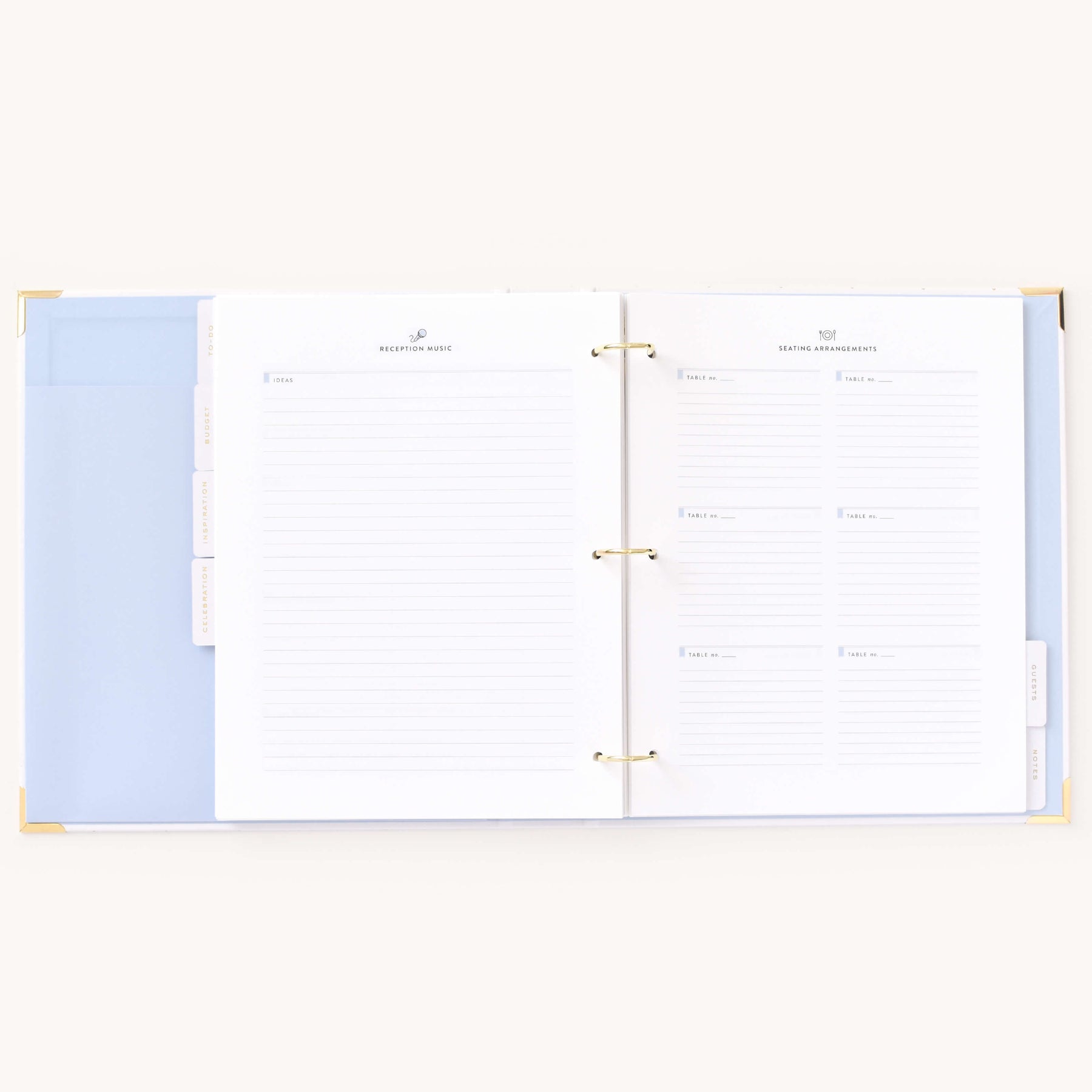 This wedding planner is designed to help couples stay organized while planning their big day. Packaged in a beautifully crafted box with elegant gold foil details, this undated binder-style planner features a white leatherette cover with a subtle dot pattern, gold protective corners, and a coordinating inside liner and pocket. It includes a sticker sheet, six sections filled with planning pages and worksheets, and high-quality pure white paper, making it a thoughtful and practical tool for wedding planning.