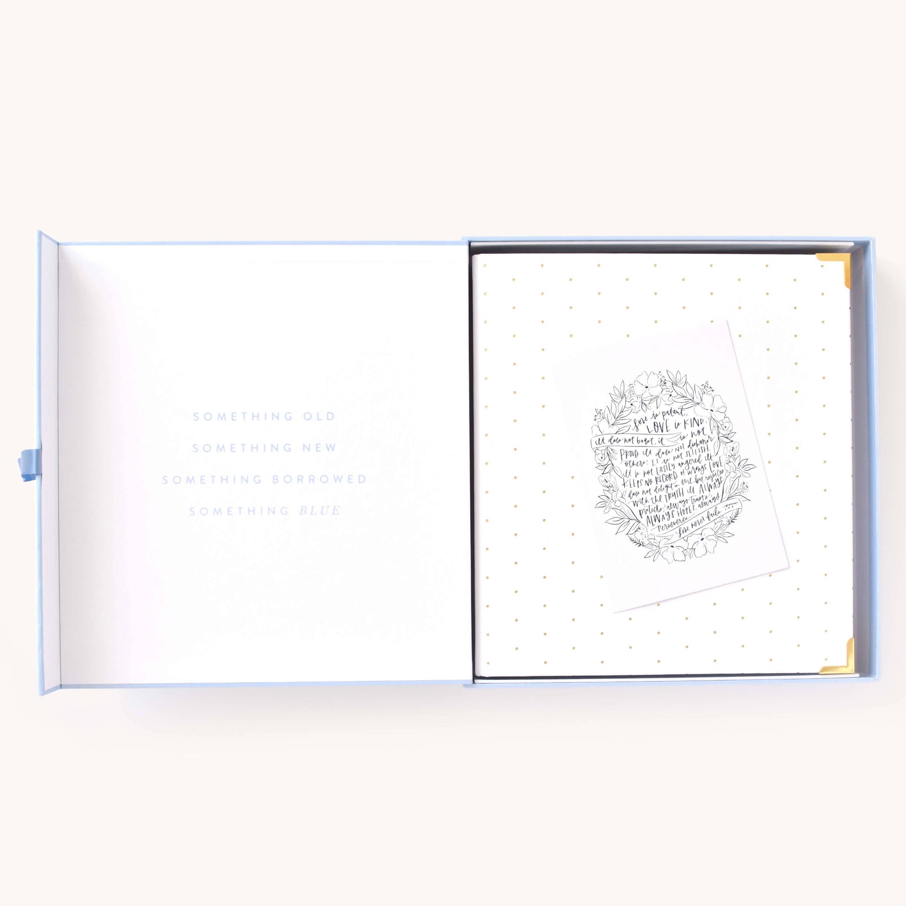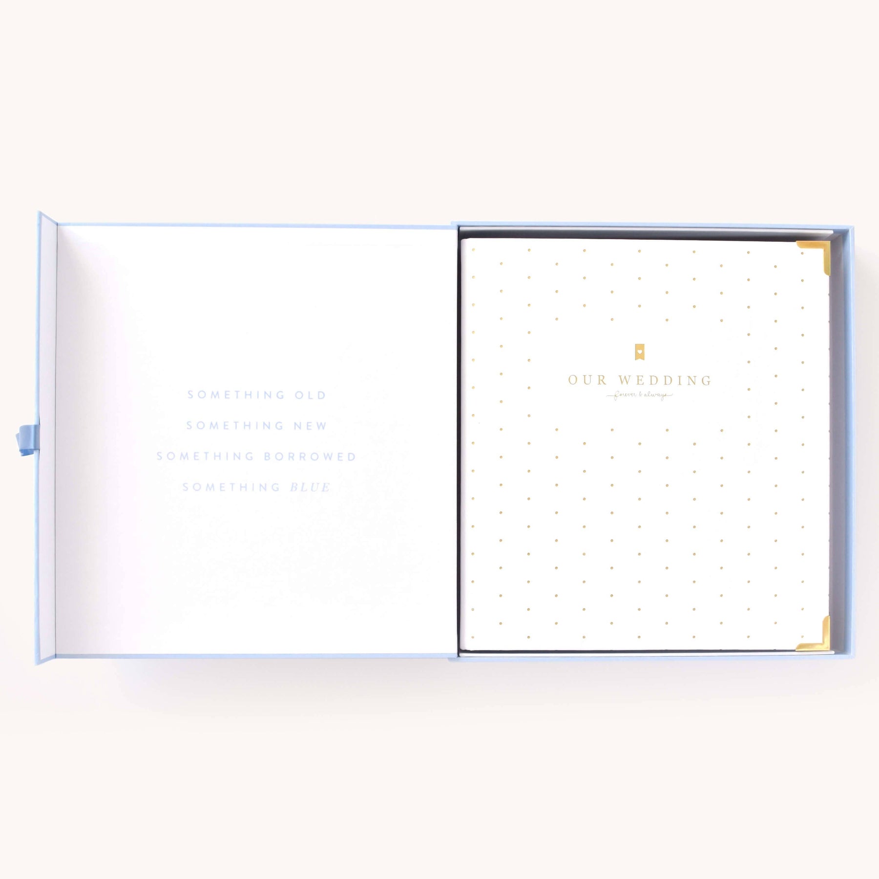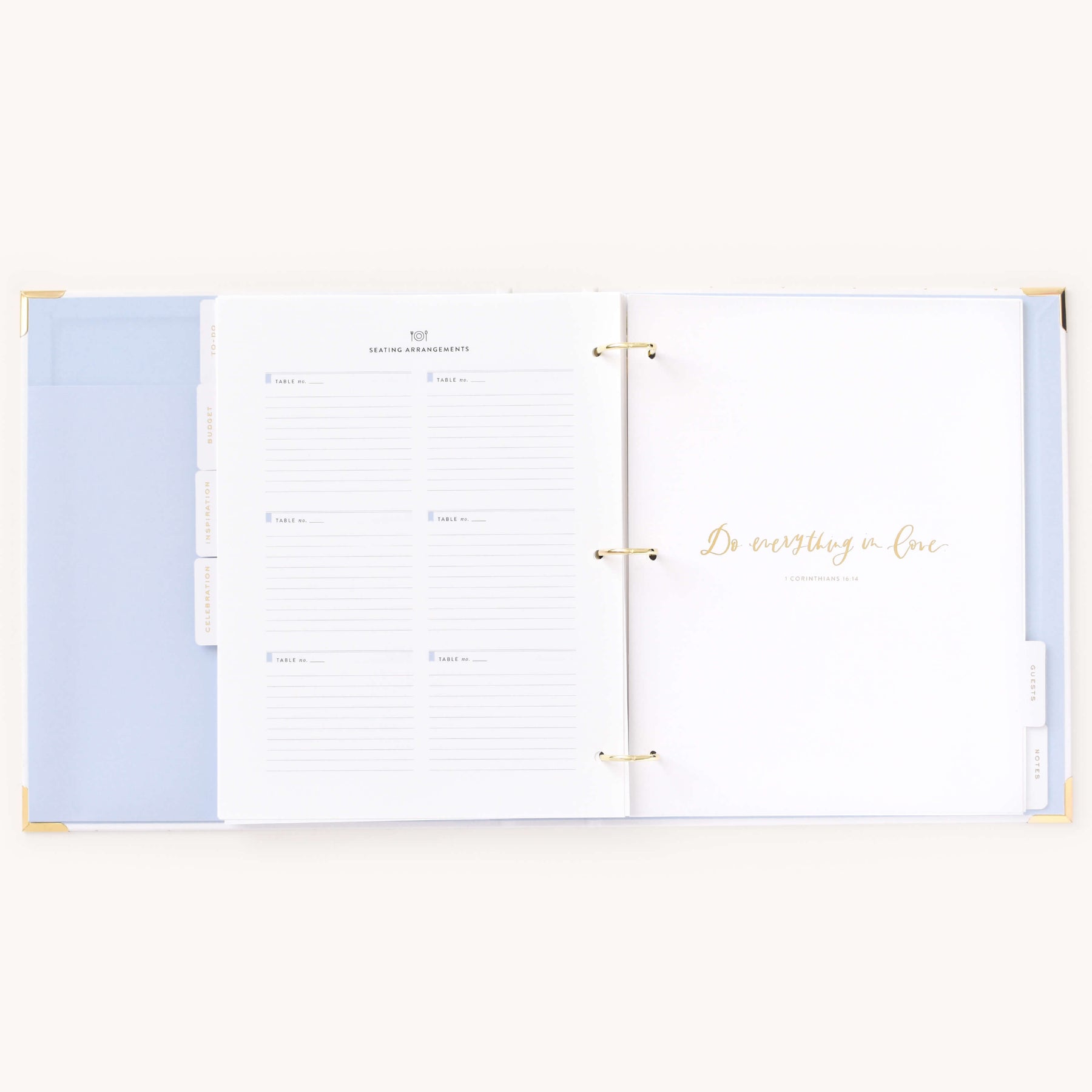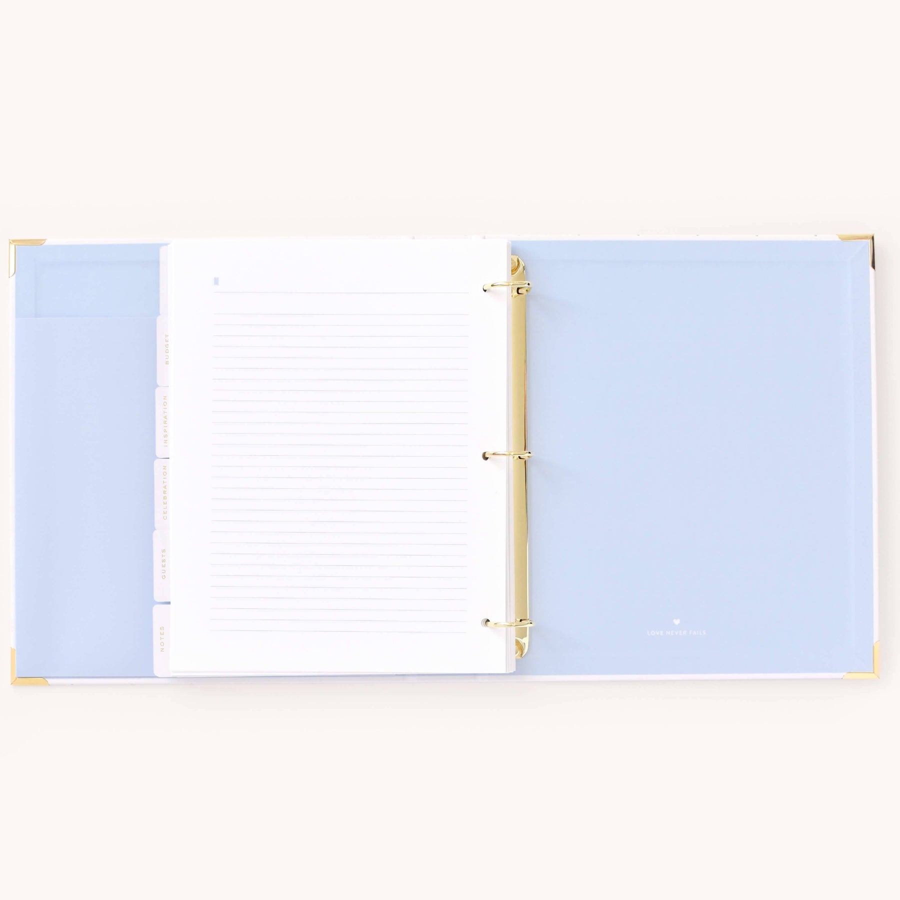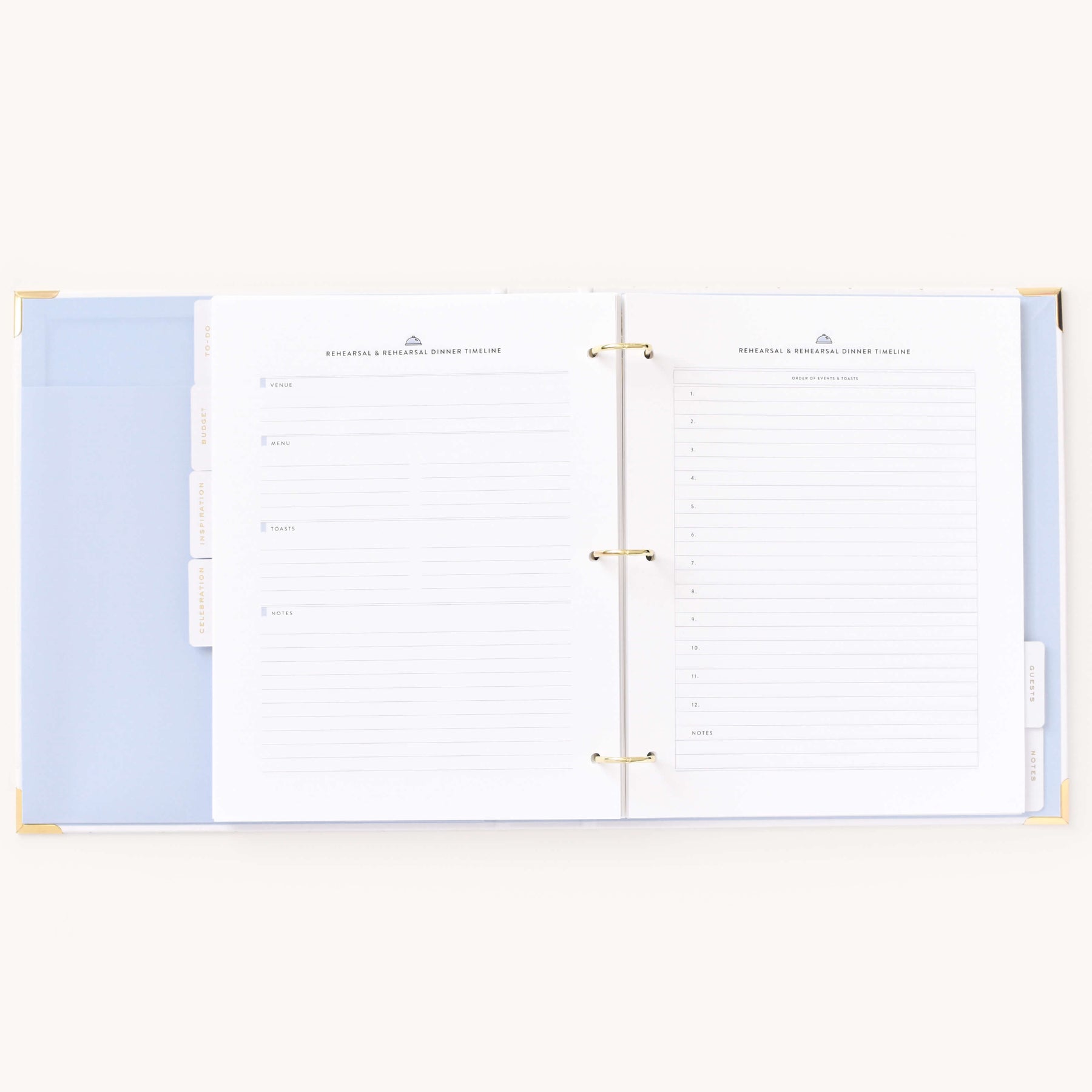 This wedding planner is designed to help couples stay organized while planning their big day. Packaged in a beautifully crafted box with elegant gold foil details, this undated binder-style planner features a white leatherette cover with a subtle dot pattern, gold protective corners, and a coordinating inside liner and pocket. It includes a sticker sheet, six sections filled with planning pages and worksheets, and high-quality pure white paper, making it a thoughtful and practical tool for wedding planning.